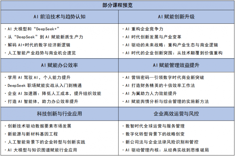 本次“人工智能+办理”高级班课程和将分为“AI前沿手艺取趋向认知”、“AI赋能立异升级”、“研学课程”等七大模块,但每期准绳上放置最多不跨越3人加入进修。电子科技大学积极响应国度“扶植全平易近终身进修的进修型社会、进修型大国”的号召,相关课程放置如下:产学研合做对接:放置产学研对接环节,查看更多从题:邀请出名校友或行业专家进行从题,